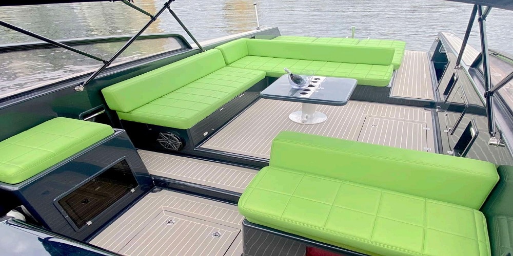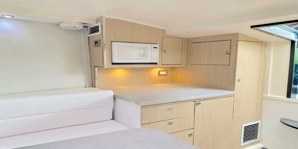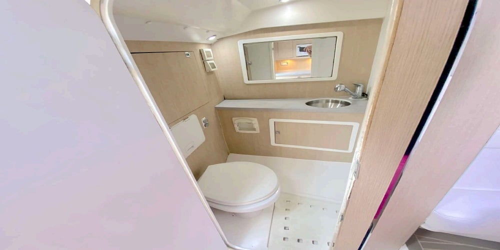 Enjoy a crowd-pleasing cockpit with ample plush seating for 8; a comfortable cabin with a large bathroom, and even a large open sunpad bed lounge area on the bow that seats 4-6 that’s sure to be the most popular seat in the house. Enjoy the rear sunpad as well.